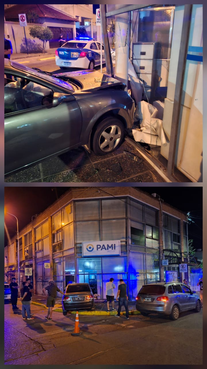El automóvil Chevrolet Corsa a raíz del accidente termina impactando en las instalaciones del PAMI, produciendo daños de consideración.