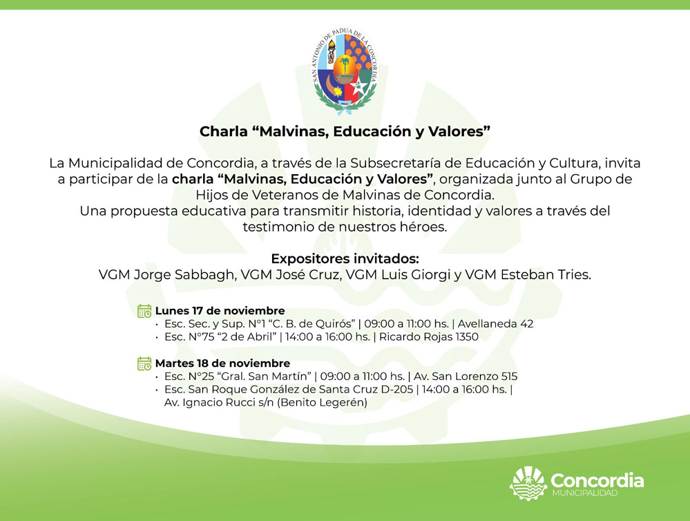 La Municipalidad de Concordia, a través de la Subsecretaría de Cultura y Educación, llevará adelante la charla “Malvinas, Educación y valores”, organizada junto al Grupo de Hijos de Veteranos de Malvinas de Concordia.