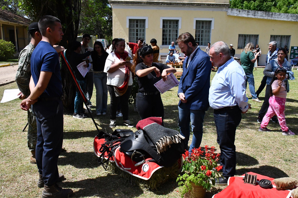 El Intendente Francisco Azcué, junto al Subsecretario de Educación y Cultura Carlos Gatto y el Jefe del Regimiento Teniente Coronel Jorge Andrés Camarino, hizo la entrega de certificados y recorrieron la muestra de los trabajos realizados en pintura, carpintería, sastrería y cuidador de caballos deportivos.