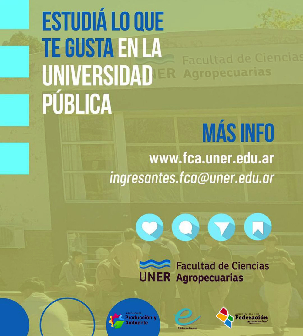 El Municipio de la ciudad de Federación, a través de la Dirección de Producción y Ambiente, junto con la Oficina de Empleo Municipal informan a la comunidad que, a partir de hoy, lunes 1 de diciembre de 2025, se encuentran abiertas las inscripciones para las siguientes tecnicaturas a distancia de la Universidad Nacional de Entre Ríos (UNER) – Sede Oro Verde: