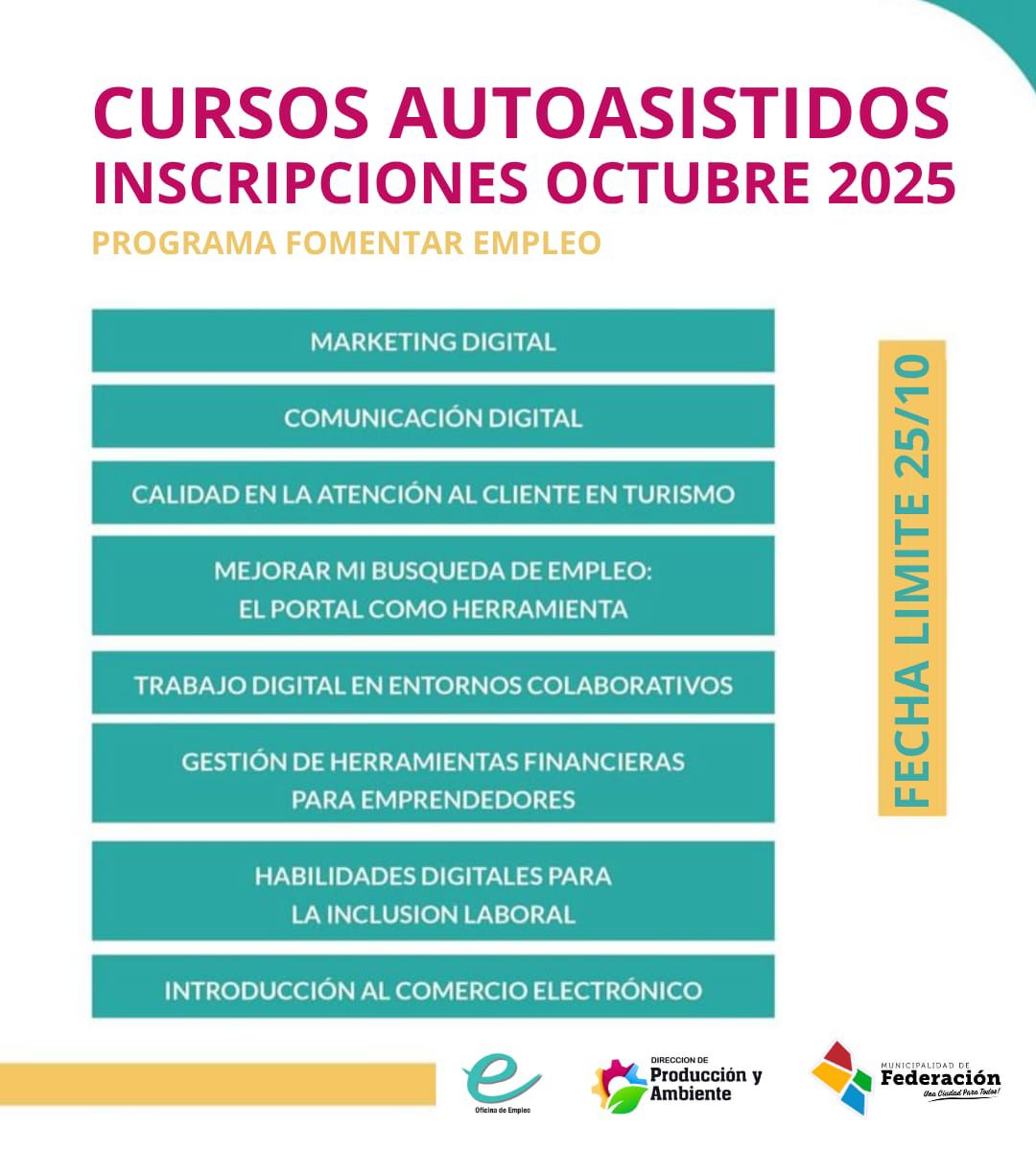 El Municipio de Federación, a través de La Oficina de Empleo – Dirección de Producción y Ambiente – informa que continúa abierta la inscripción para los cursos autoasistidos.