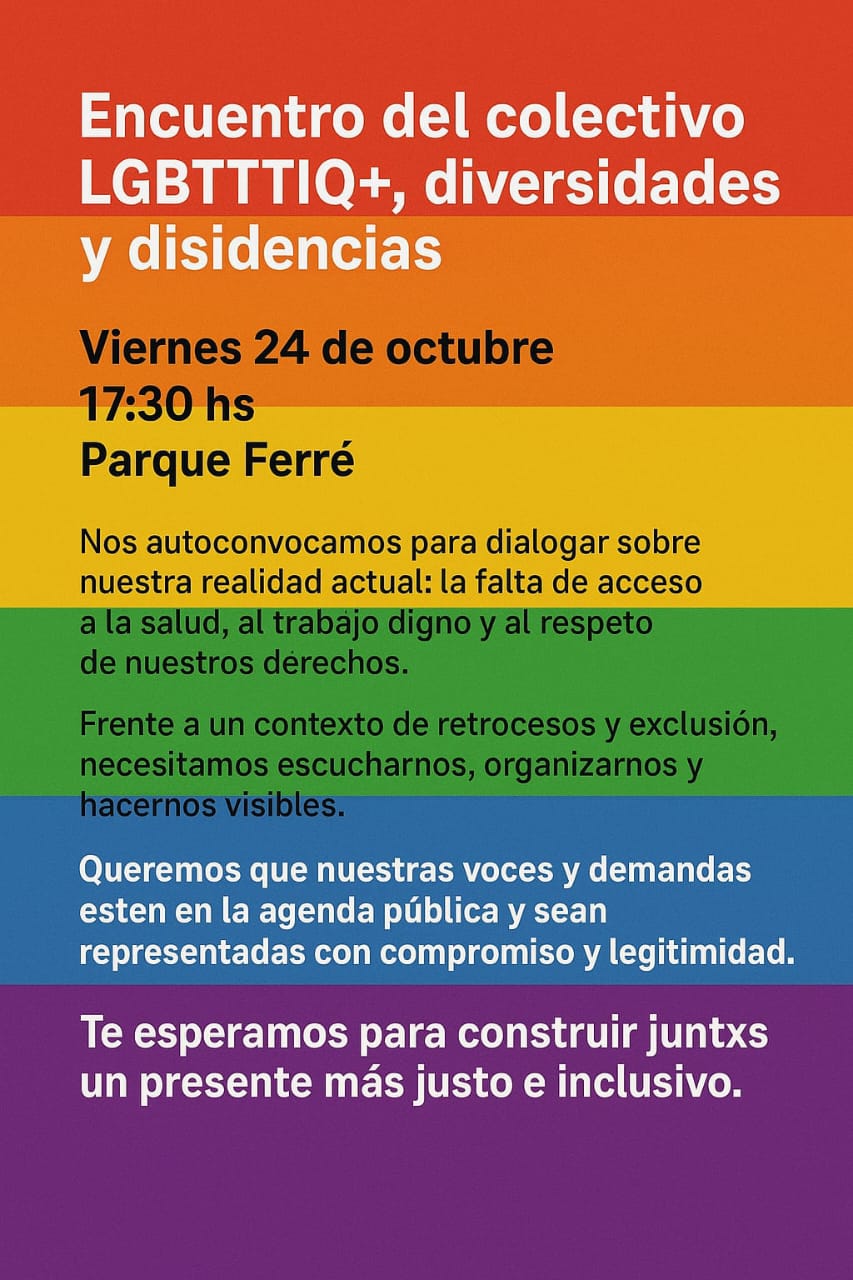 Este viernes 24 de octubre, a las 17:30 hs, reunión/auto convocatoria en el Parque Ferré del colectivo LGBTTTIQ+, diversidades y disidencias para poner en común su realidad en estos tiempos tan complejos.