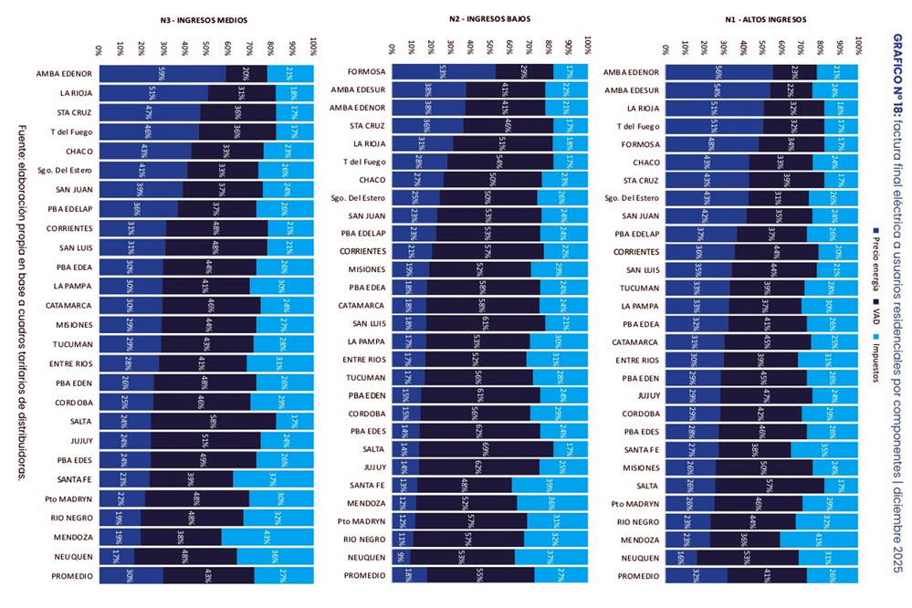 El informe analiza la composición de la factura eléctrica a partir del precio de la energía, el Valor Agregado de Distribución (VAD) y la carga impositiva, y muestra que Entre Ríos presenta un nivel tarifario inferior al promedio nacional en los tres segmentos de usuarios considerados: ingresos altos, medios y bajos. Esta situación consolida un esquema de mayor equilibrio tarifario en comparación con otras jurisdicciones del país.