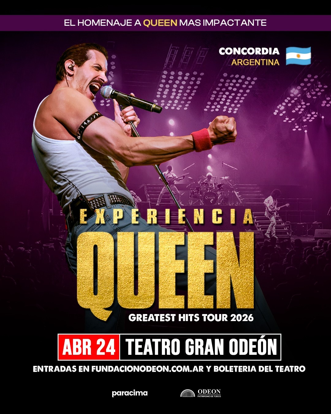 24 de abril – 21 hs La potencia, la emoción y la épica de Queen vuelven a cobrar vida en una noche única. El próximo 24 de abril a las 21 hs, llega “Experiencia Queen – Greatest Hits Tour 2026”, un espectáculo que invita al público a revivir los grandes clásicos de una de las bandas más legendarias de todos los tiempos.