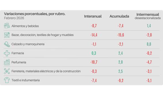 El relevamiento por rubros ratificó el proceso de contracción: seis de los siete sectores monitoreados cerraron con resultados negativos. Las bajas se encontraron en Bazar y decoración (-14,4%), Perfumería (-10,7%) y Alimentos y bebidas (-8,7%). Farmacia constituyó la excepción, con un incremento del 0,3% interanual.